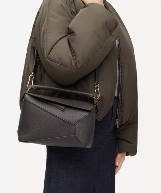 The Small Puzzle Edge Shoulder Bag is a sophisticated and versatile accessory, crafted from premium textured leather. Its unique geometric design, featuring angular panels and Loewe's signature Anagram logo, adds a modern edge to its timeless silhouette. With a compact yet spacious interior, it offers ample room for essentials, making it perfect for both everyday use and special occasions.